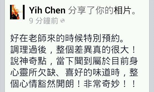 我為他調了這瓶油,在人來人往的新左營高鐵站為他做手部按摩和心輪按摩,看著他的眉頭漸漸舒展開來。不到5分鐘的按摩,他已經全然放鬆。直到按摩後他還不願意睜開眼睛,說他很久沒有這麼輕鬆的感覺了。